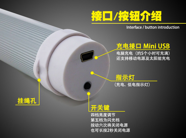 2. 按动开关时,亮度将会由低到高调节,按动第五次时为闪光档,按动第六次将关闭电源。在任何点亮关态下长按2秒即可关闭电源。