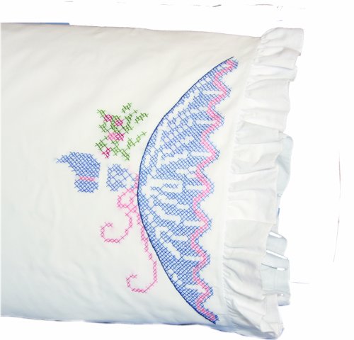 Fairway Needlecraft 82519 Vintage Ruffled Edge Pillowcases, Cross Stitch Lady Design, Standard, White