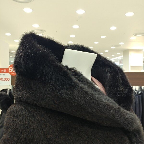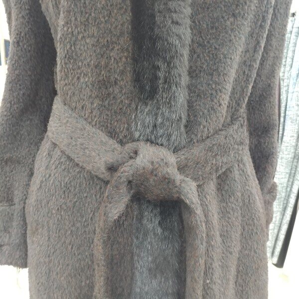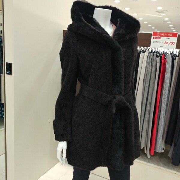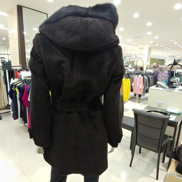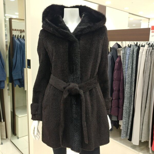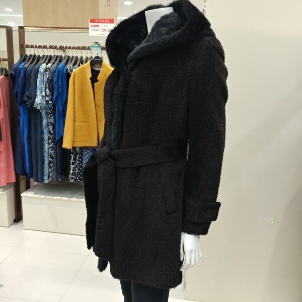 밍크털이 후드에 부착되어 있어 따뜻함을 강조..앞쪽중심선에도 밍크로 장식 고급스럽다..허리벨트로 여성스러움을 강조..!!