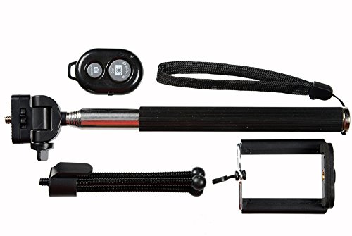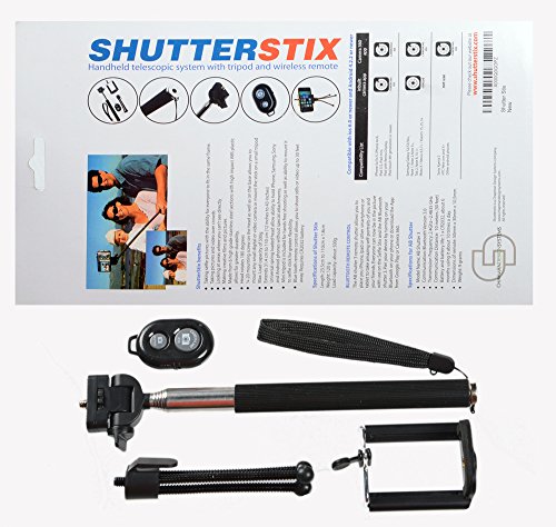 Extra-long Durable Selfie Stick Kit with Tripod by Shutterstix for iPhones, Samsung, Hero & Compact Cameras, with Bonus Tripod, Bluetooth Wireless Remote Control; Latest Version, Light-weight & Compact