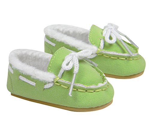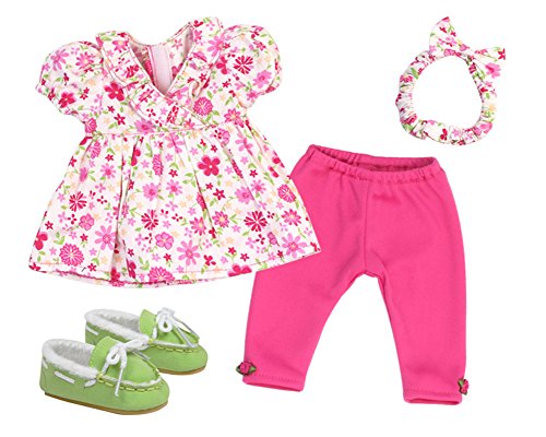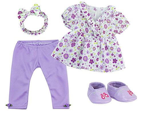 Perfect set for baby twins or a great mix and match for one doll. 8 Pieces include two blouses, 2 leggings, two headbands and two pairs of shoes; comfortable green slip on moccasins and purple flip on with butterfly design. Perfect for 15 inch dolls including American Girl ®. Doll Not Included. © 2016 Sophia's®- All Right Reserved. Not affiliated with American Girl ®, Reg. Trademark of American Girl, LLC.Feature