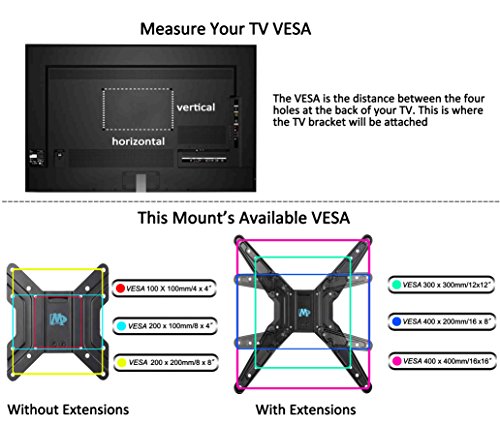 -. Feature : Heavy duty unit fits for most of 26-55" TVs up to 55 LBS, with max VESA 400 x 400mm. Please refer to product pictures to check: VESA/mounting holes spacing, stud location, possible blocked input, to determine whether this mount fits your TV and the installation application. / Viewing becomes more flexible: +5°/-15° tilt to reduce glare, +/-90°swivel side to side to position TV. / VESA plate can be taken off for easy installation, and +/-5° rotation allows post-installation to perfectly level TV. / Automatic robot welding technology makes whole unit sturdy and good appearance. / US based customer support answers your pre-purchase and installation questions, and product is 10-year warranty