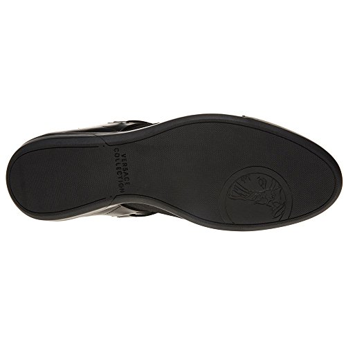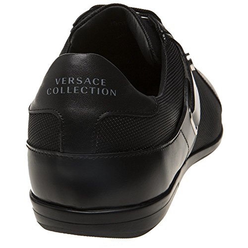 Binding : Apparel Product Description Versace Collection Formal trainers combine a classic dress shoe with a sleek athletic silhouette. Sleek black uppers feature metallic eyelets and signature branding to the side and back. Leather lining creates a luxury edge while the slim rubber sole completes. 0