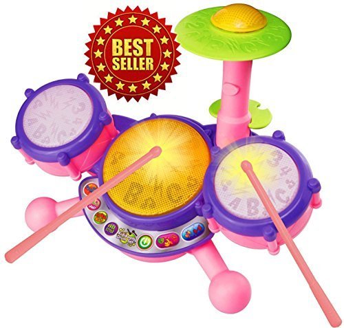 -. Feature : Learning toy has three drum pads and cymbal, each with its own unique sound / Play along to nine pre-set melodies in a variety of styles including rock, dance and pop / Choose from four different sounds for the drums, Each drum illuminates with an LED light / Drum set for kids has four modes of play: Free Play, Letters, Numbers, and Follow Along / Exclusive pink color