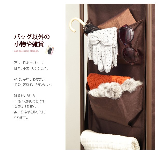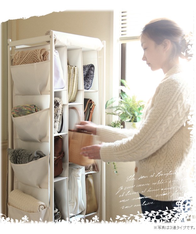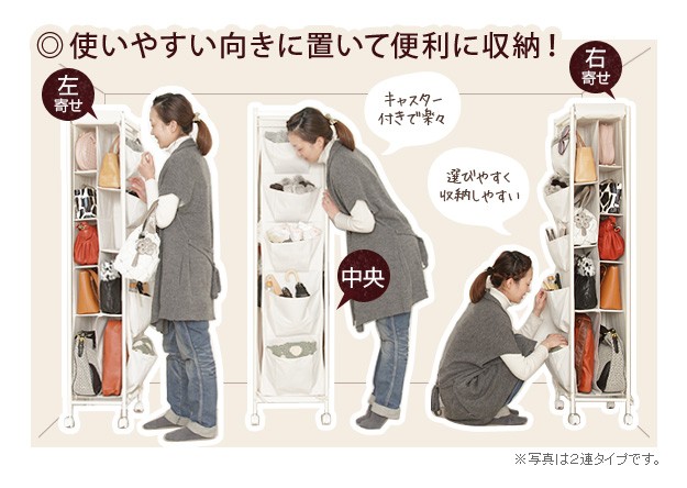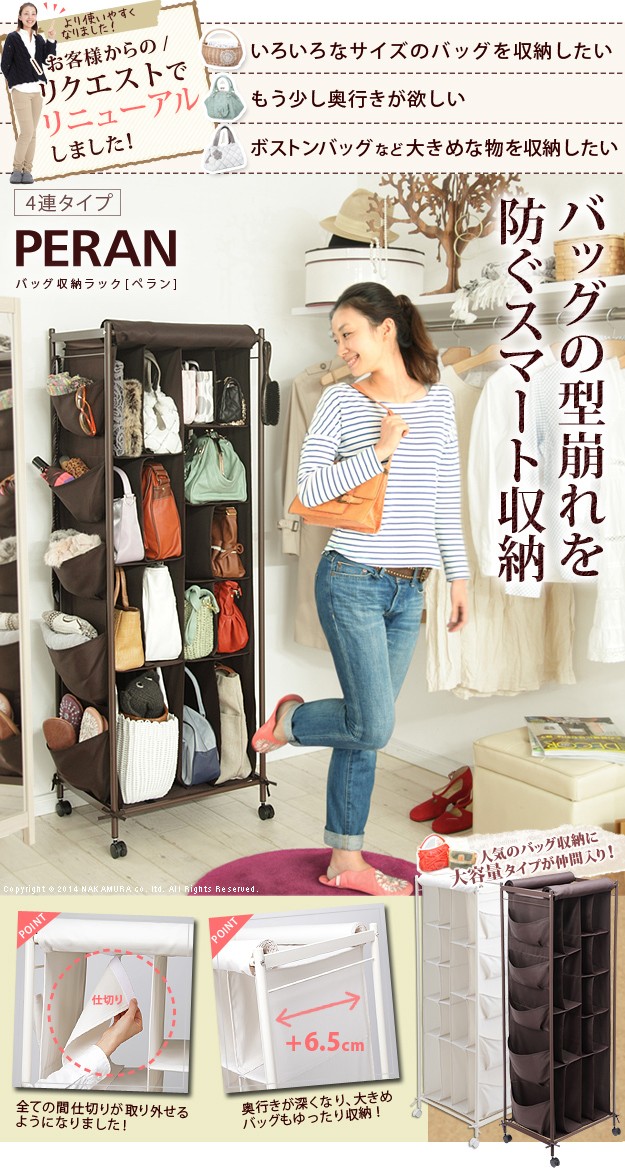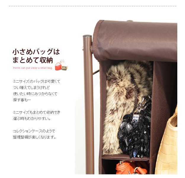 商品について:バッグ収納ラック4連。どんどん増えて収納場所に困るバッグを省スペースにスッキリ整理整頓。