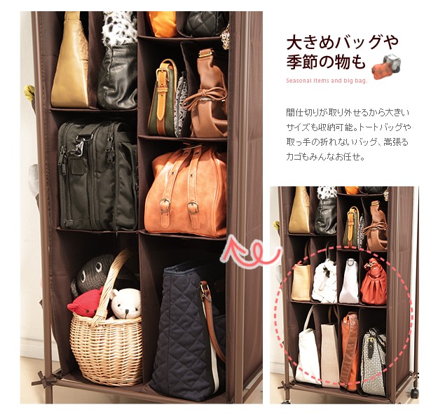 バッグの型崩れやホコリを防いで1か所にまとめて保管できるラックです。最下段収納部の仕切りは取り外せるので幅のある大きめバッグも収納OK!