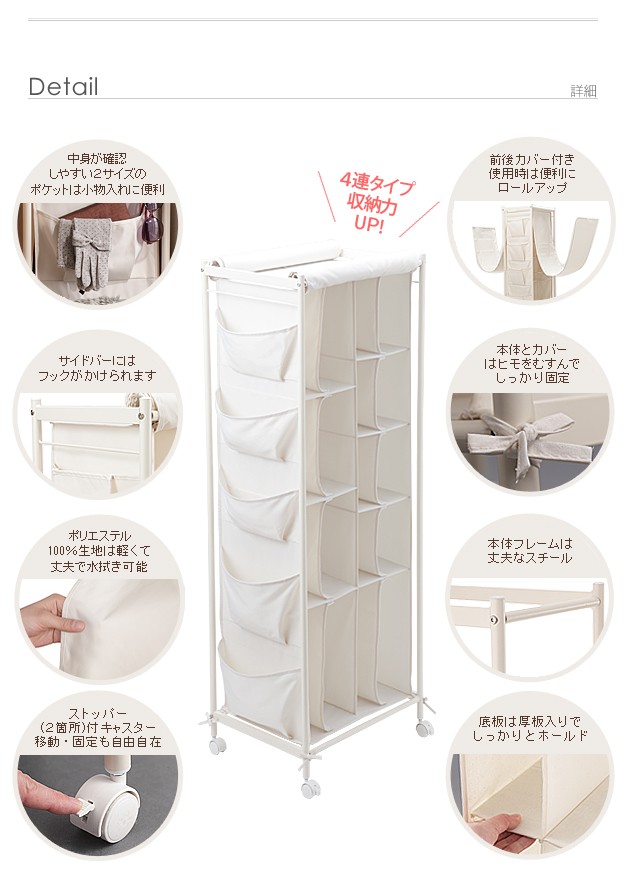 側面には普段使いの小物収納に便利なポケット付き。カバーは前後に付いているので、使いやすい向きに置いてお使いいただけます。