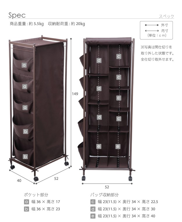 サイズ(cm):幅52x奥行40x高さ149(キャスター含む)・約5.5kg