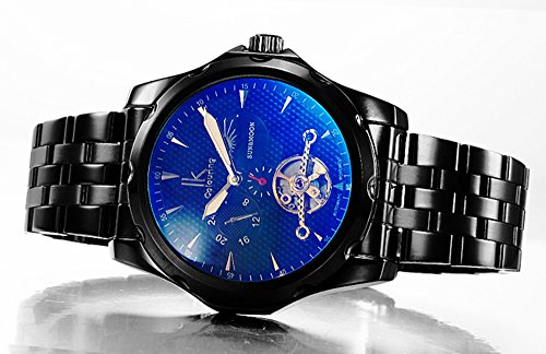 -. Feature : GuTe出品のメンズの機械式自動巻き腕時計 / 文字盤に一番の見所である機械感溢れるビンテージなトゥールビョンから時計の動きは生で見える。 / 時間のチェックしやすいブラックの文字盤に二つの小文字盤(二十四時間・昼夜)が収められる / 幅約20mmのブラックのステンレスバンドに厚さ約14mm・直径約42mmのケースにブルーに映るガラス / 説明書は付いてますが、調節方法がどうしてもわからない方は、簡単な説明が書いてある「商品説明文」までチェックしてください。そして買う前に要注意!商品イメージで見えるガラスのブルーは実物のガラスのブルーと少々色収差がありまして、とても気にするお客様は慎重なご検討を!他に何か問題がありましたらご遠慮なくお問い合わせください。
