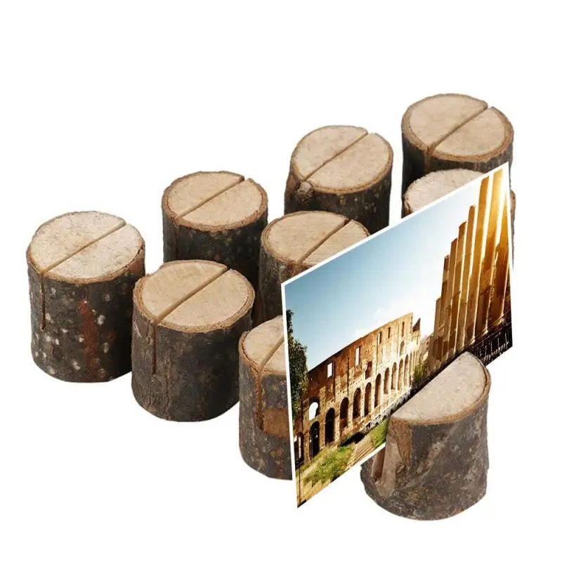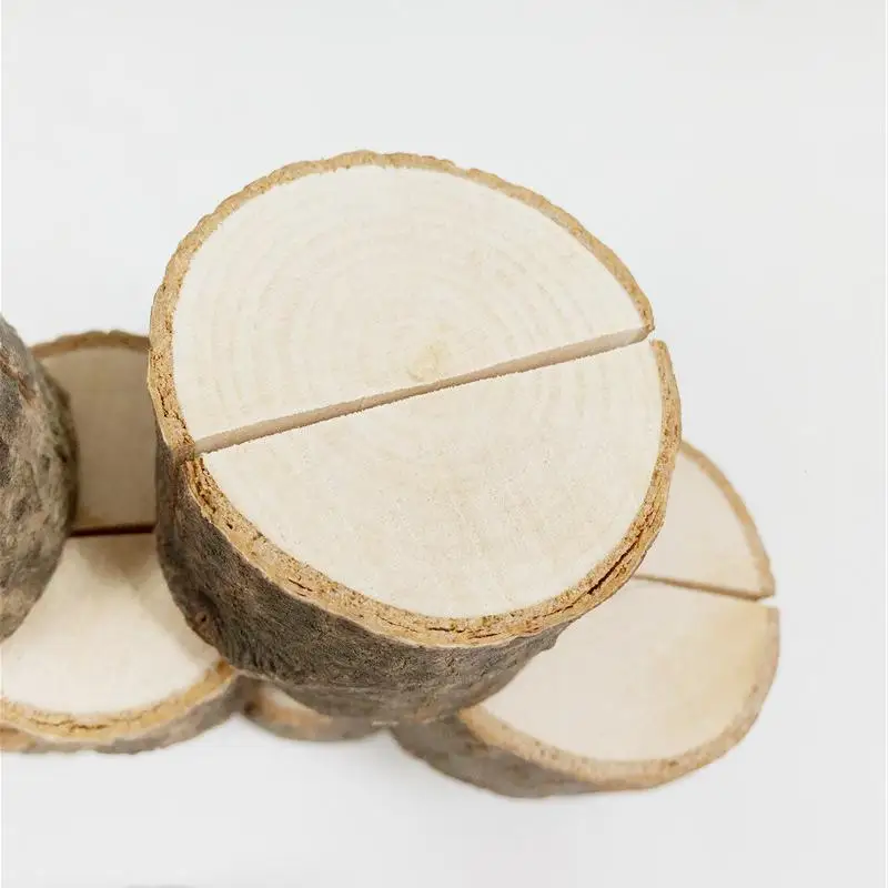 This item is a place card table number holder, which is made of natural wood. Real wood place card/photo holder with visible age circles and a slit on the top for place card or photo. It is suitable for wedding favors, offices, anniversaries party, home decorations etc.
