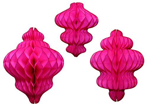 Studio : Devra Party Publisher : Devra Party Binding : Kitchen Product Description Set of 3 honeycomb tissue paper hanging ornament decorations in bright cerise. The pack includes three hanging honeycomb decorations in different vintage inspired styles: one 11 inch hanging lantern shaped decoration, one 10 inch chandelier shaped decoration, and one 8 inch ornament with a spinning top design. The decorations ship flat and come with an attached hanging string and sticky tape to keep the decorations open. Made in the USA by Devra Party. 0