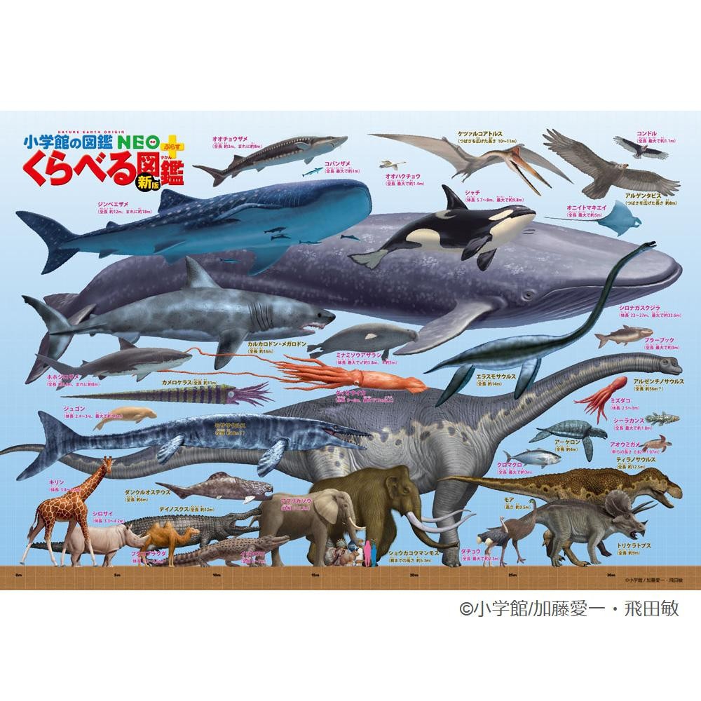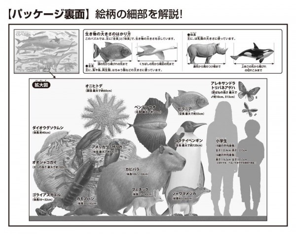 ティラノサウルスなどの大昔の生き物から、現存するシロナガスクジラなど大迫力の巨大生物をくらべて学べるジグソーパズルです。親子で気軽に楽しめる大きなピース。