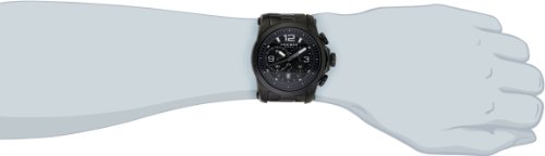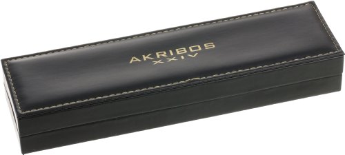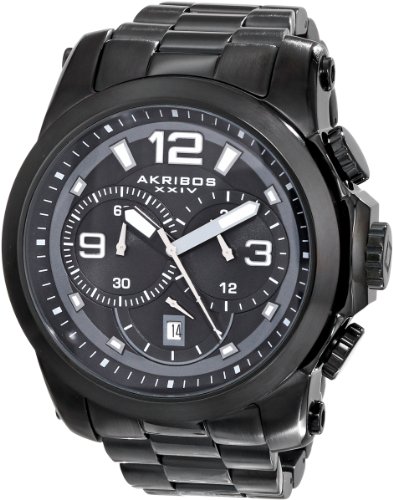 ReleaseDate : 2013-11-20 Studio : Akribos XXIV Publisher : Akribos XXIV Binding : Watch Product Description Black PVD stainless steel case and bracelet. Fixed black PVD bezel. Black dial with luminous silver-tone hands and index hour markers. Arabic numerals mark the 3, 9 and 12 o'clock positions. Minute markers around the outer rim. Dial Type: Analog. Luminescent hands and markers. Date display at the 6 o'clock position. Chronograph - three sub-dials displaying: 60 second, 60 minute and 24 hour. Japanese quartz movement. Scratch resistant mineral crystal. Pull / push crown. Screw down case back. Case diameter: 50 mm. Case thickness: 17 mm. Round case shape. Band width: 24 mm. Band length: 9 inches. Fold over clasp with double push button release. Water resistant at 50 meters / 165 feet. Functions: hour, minute, second. Sport watch style. Akribos Black Dial Chronograph Stainless Steel Mens Watch AK631BK. 0