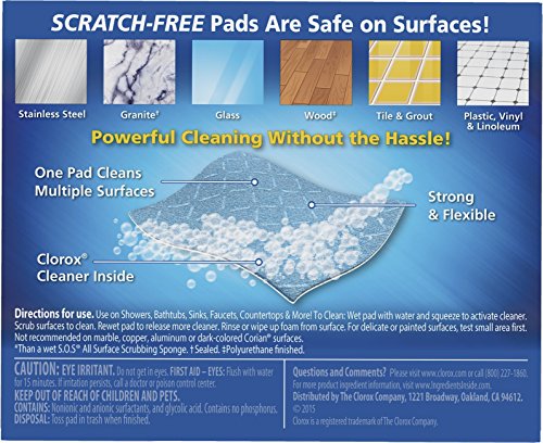 -. Feature : 12 count box of disposable scrubbing pads preloaded with Clorox cleaner / Strong and flexible scrubber pads clean multiple surfaces / Bleach-free pads power through soap scum and grime / Contains powerful bathroom cleaner in Rain Clean scent / Simply wet, scrub and toss for easy bathroom cleaning