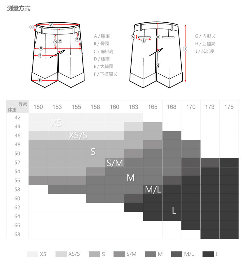 身高/净腰围 腰围 臀围 前裆 后裆 裤长 大腿围 显示尺寸