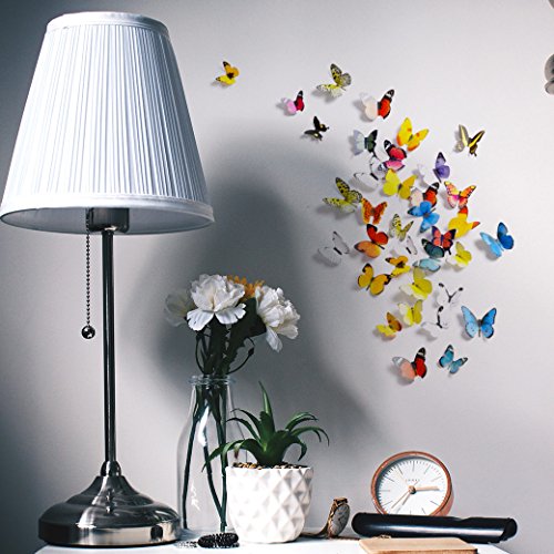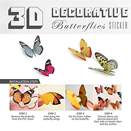 -. Feature : VIVID BUTTERFLY WALL STICKERS SET: 38 pieces artificial butterfly stickers with different style, DIY different shape you like to enjoy different moods. / EASY TO STICK - Apply to dry, clean and smooth surfaces; clean the place you want to stick the butterfly, just peel the paper on the butterfly, paste them, and make sure their wings lift up. / USE FOR A LONG TIME - Butterfly wall decals is made of PVC material, durable, anti-dust, convenient for you to clean which can make the butterfly last longer. / VERSATILE: Apply to decor a theme party, Wall Decals, Butterfly museum embellishment, Children room, Photography background, Christmas, Wedding, Birthday, etc. / 100% MONEY BACK GUARANTEE - When you order our 3D Butterfly Wall Decals today, you're protected by a 60 day, no-questions asked money back guarantee. TOTALLY RISK FREE, why not give it a try .