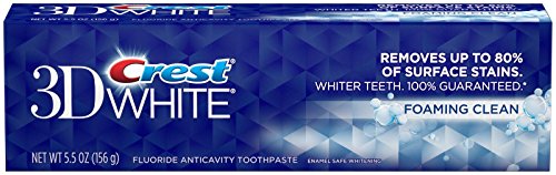 Treat your mouth to a trusted whitening experience with Crest 3D White Foaming Clean whitening toothpaste. Designed to remove up to 80% of surface stains, our Foaming Clean toothpaste delivers a whiter smile. Using an enamel-safe whitening formula, it gently polishes away surface stains and its Micro-Cleansing Foaming Complex cleans hard-to-reach places. For a whiter smile you can see, try Crest 3D White Foaming Clean toothpaste.;Removes up to 80% of surface stains Micro-Cleansing Foaming Complex cleans hard-to-reach places;Micropolishers and foam actively whiten teeth by removing surface stains;Whitens Smile in 2 days**Whitens by removing surface stains when using Crest 3D White Foaming Clean whitening toothpaste, Crest 3D White Luxe Arctic Fresh Multi-Care Whitening rinse, and Oral-B Advantage 3D White Vivid toothbrush.;Whiter Teeth. 100% Guaranteed****Satisfaction guaranteed. See package for details.