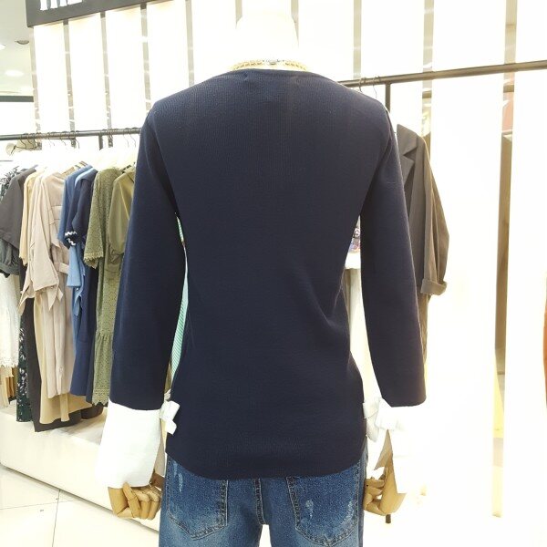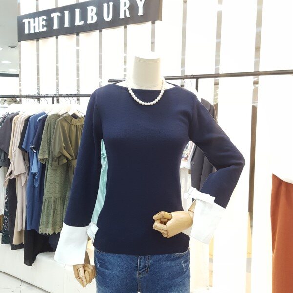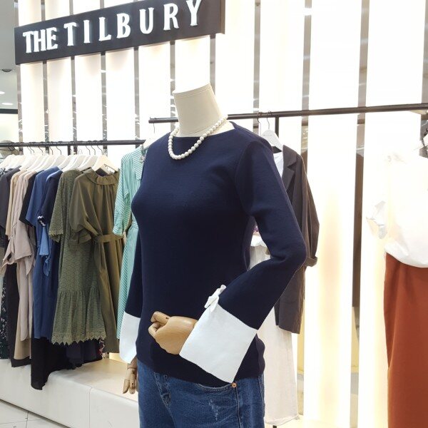 배색커프스디자인으로 감각적이며 클래식한 무드가 느껴지는 니트입니다.심플하게 즐길수있는 라운드넥디자인이며소매리본장식으로 한층 로맨틱하며 A라인스커트와 코디 추천합니다.