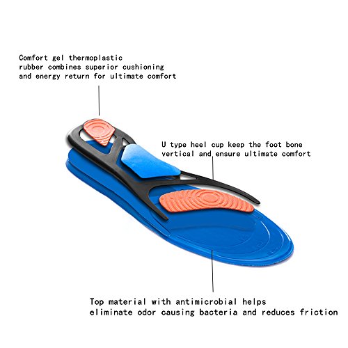 - Comfort gel thermoplastic rubber combines superior cushioning and energy return for ultimate comfort. Shoe insoles top material with antimicrobial helps eliminate odor causing bacteria and reduces friction.