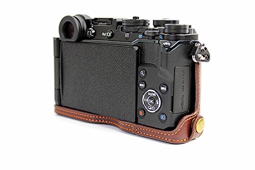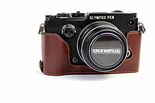 Bottom Opening Version Protective Genuine Real Leather Half Camera Case Bag Cover with Tripod Design for Olympus PEN-F Camera with Genuine Real Leather Hand Strap Dark Brown