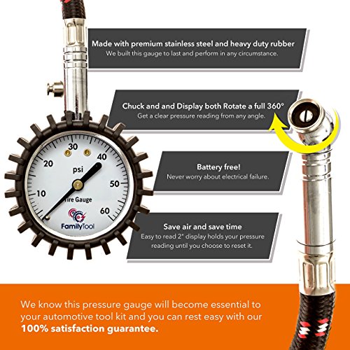 - RUGGED ALL WEATHER DESIGN - The tire gauge is made with professional grade steel and flexible mechanic grade rubber. The Large, high contrast dial face reads up to 60 PSI and is attached to a unique 360 degree swivel that makes reading your tire pressure easy at any angle. Assembled with durable and tough materials, the tool can take a beating and still perform when you need it most.