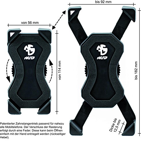 Variable Grossenanpassung durch patentierten Zahnstangentrieb fur Smartphone, Handys mit den Breiten 56-92 mm, Langen 114-182 mm z.B. alle iPhones und Samsung Gerate. Stufenlose Montage durch Zahntrieb, auch passend mit Ihrer eigenen Schutzhulle bis 12,5 mm Dicke.