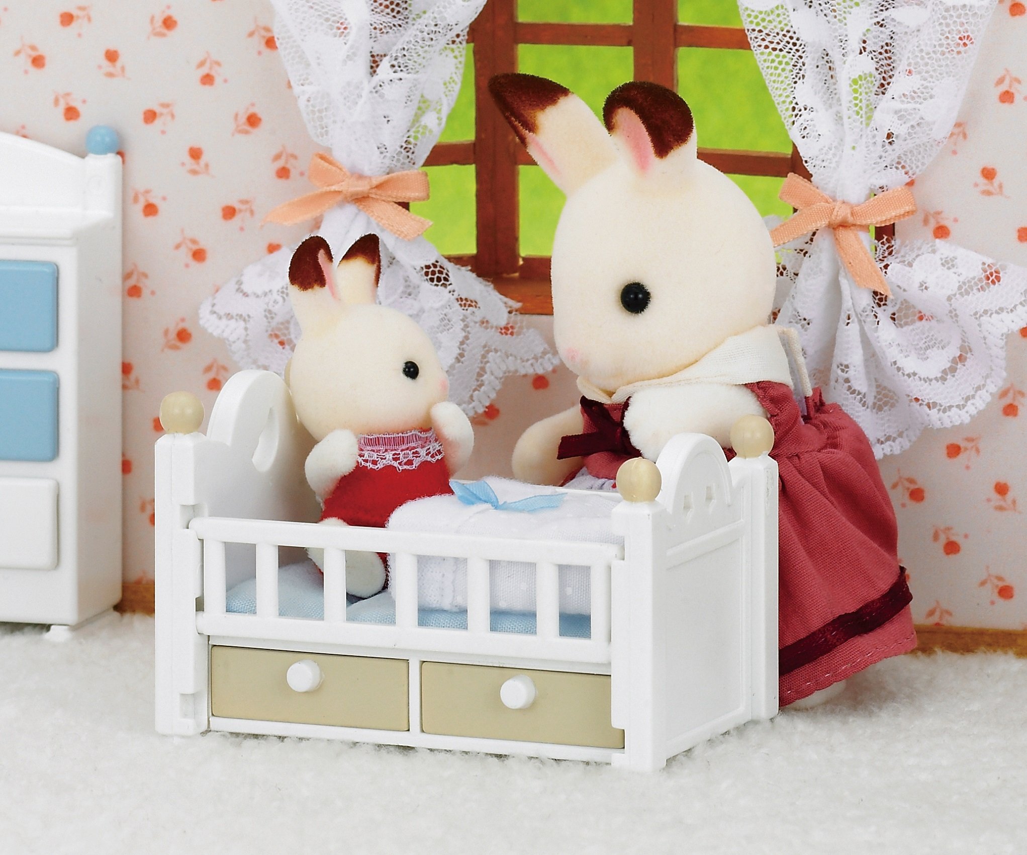 A doll and furniture are together, it is a furniture set of a chocolate rabbit baby.