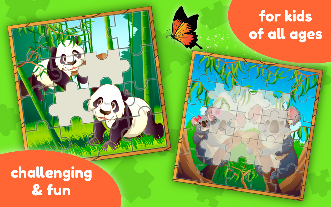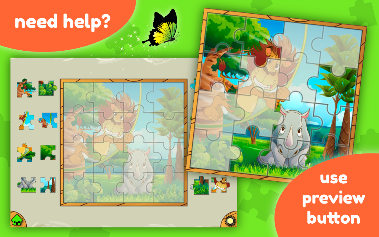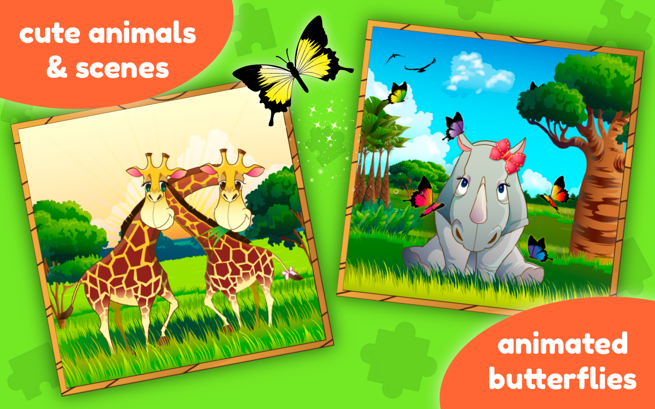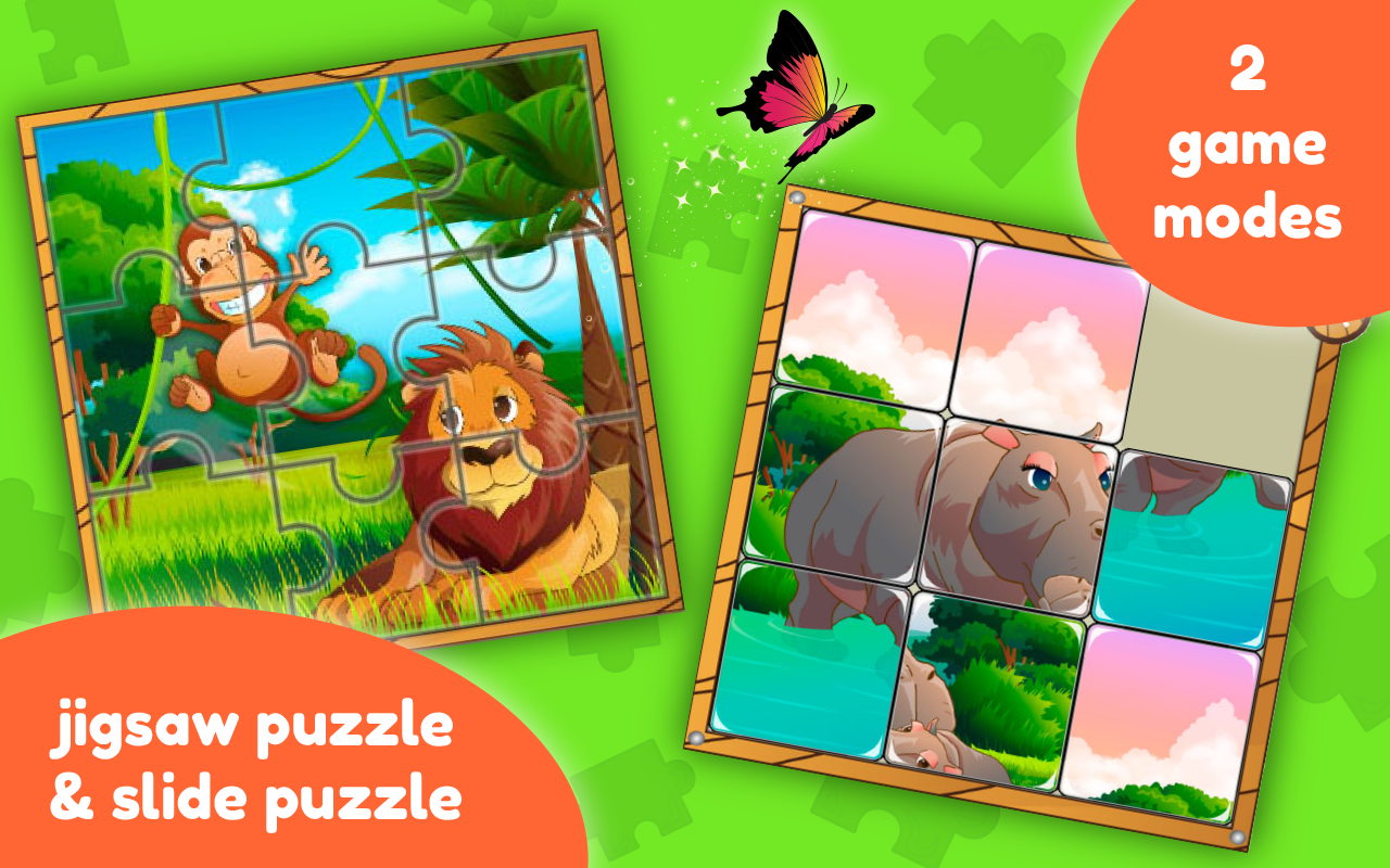 - Feature : Improve memory, logical thinking, visual perception and fine motor skills / 4 difficulty levels (3x3, 4x4, 5x5, 6x6) / 10+ Jungle Theme Jigsaw Puzzles (lion, elephant, monkey, wild pig, fish, butterfly, panda, koala, rhino, crocodile, giraffe, buffalo, hippo) / Slide puzzle minigame / Beautiful high quality HD graphics / Intuitive, easy to use interface / Fun for the whole family - kids and adults / Designed as an educational tool for small children / Designed for phones and tablets