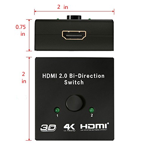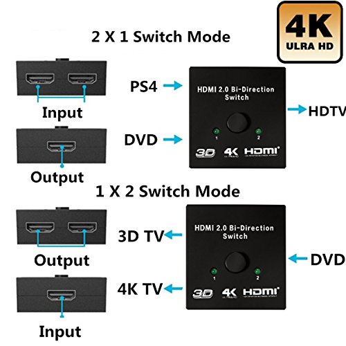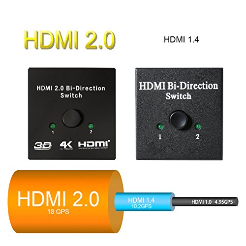 - ► 4K@60Hz, 1080p, 3D, Deep Color, HDCP pass-through, uncompressed and compressed audio formats are all supported, Bi-Direction Switch is Easy install & operation.No external Power required.Support HDMI Plug & Play.Connect two HDMI sources to one HDMI display Or connect one HDMI source to toggle between two displays