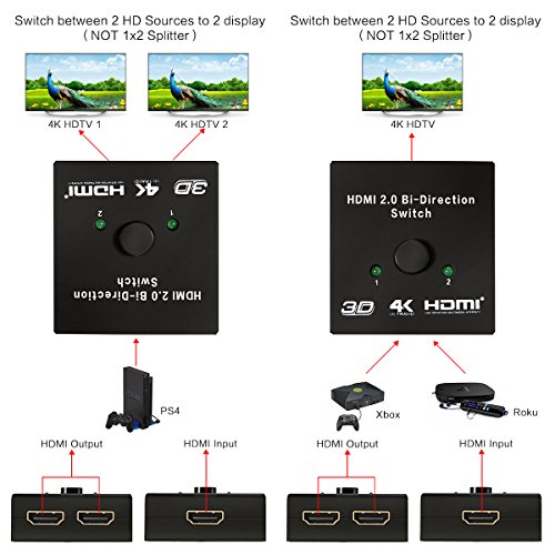 - ► EASY OPERATION:HDMI Bi-Direction Switcher is Easy install & operation.No external Power required.Support HDMI Plug & Play.Connect two HDMI sources to one HDMI display Or connect one HDMI source to toggle between two displays