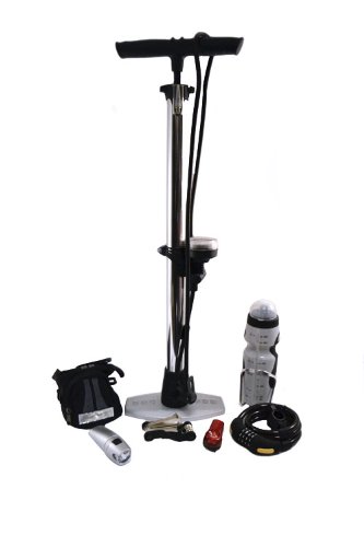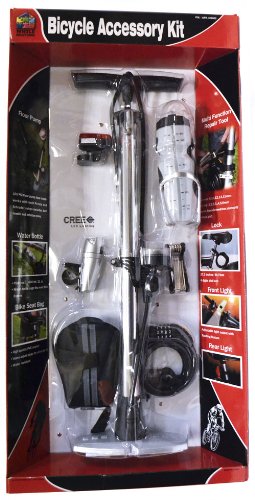 Studio : Whole Solutions Publisher : Whole Solutions Binding : Misc. Product Description This Bicycle Accessory kit is great for every biker. Whether on the go or at home this kit will come in handy. A powerful 160 PSI pump with dual nozzles works fast to pump up tires quickly. 2 LED lights will increase visibility in the dark and insure users will be seen while riding at night. The bike seat bag is made from high quality PVC and has a velcro adjustable strap to insure it will fit on any bike, and its water resistant feature adds protection to the valuables inside. The bike lock has a 4 dial lock for extra protection and ease of use while securing the bike. For those unseen accidents the multi function repair tool is small but handy to fix any of those small repairs needed while on the go. 0