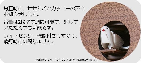 | 仕様 | カッコー時計 ステップムーブメント 音量2段階調整 ライトセンサー機能付 常温での精度:平均月差±30秒以内 使用温度範囲:-10度~+50度 使用電池:単1形乾電池2本 電池寿命:約1年 報時精度:毎正時±1分以内 時報音:せせらぎとカッコーの鳴き声 |