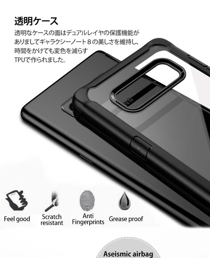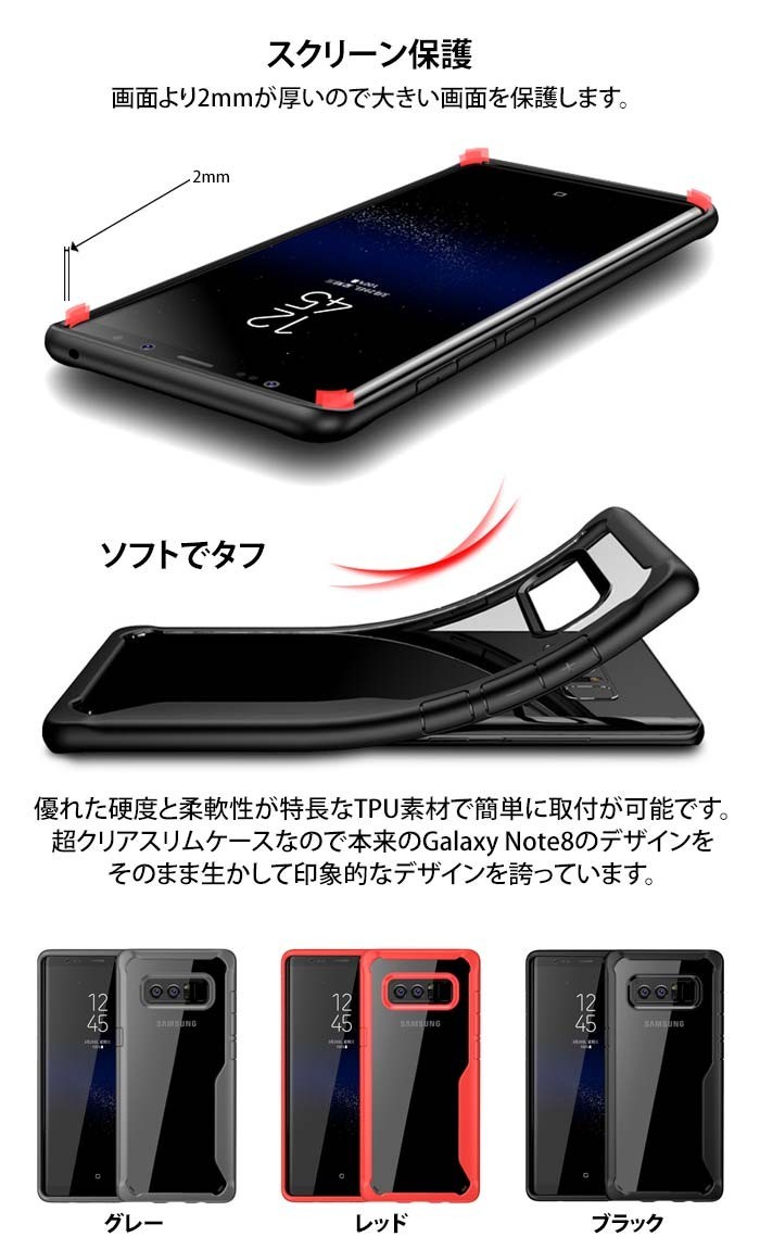 | 商品の特徴 | -このケースは、Galaxy Note 8とのみ互換性があります。 -超軽量でスリムなGalaxy Note8ケースはソフトTPU素材で簡単に取付が可能です。各ふちの角はエアクッションで保護します。 -突然の落下や衝撃を吸収します。Galaxy Note8を生活ギースやスクラッチから保護します。 -完璧なフィッティングでカメラ、ボタンなど、すべての機能のためのカットアウトされました。Galaxy Note8に完全に適したカスタマイズされた製品です。 -透明なケースの面はデュアルレイヤの保護機能がありまして、超クリアスリムケースなので本来のGalaxy Note8のデザインをそのまま生かして印象的なデザインを誇っています。 | |||