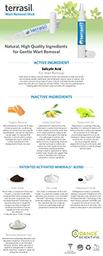 [Description] PAIN-FREE WART REMOVAL that doesn``t rely on freezing or surgery to get rid of stubborn or even recurring warts DEEP MOISTURIZING FORMULA won``t leave your skin worse for wear after Terrasil_ but instead provides nutrients for the production of new_ healthy cells PATENTED ACTIVATED MINERALS TECHNOLOGY delivers FDA approved active ingredients quickly and efficiently right where they are needed NATURAL_ ORGANIC INGREDIENTS mean that you don``t have to worry about harsh chemicals irritating your skin or slowing down healing Terrasil Wart Removal Stick MAX is good for: Common warts and plantar warts on the hands and feet. All-natural_ deep moisturizing formula that is paraben-free_ alcohol-free_ dye-free_ fragrance-free_ non-irritating_ soothing_ and safe for sensitive skin