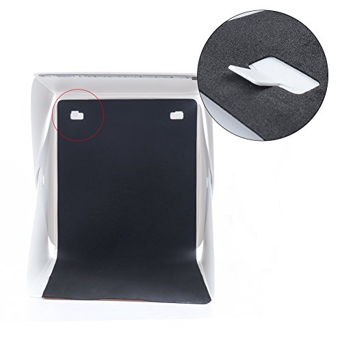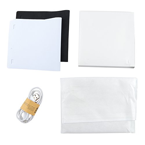 Features: 【HIGH QUALITY】 * The box is made of hard polypropylene material with matte-finished surface, which is durable to use. * It is waterproof, anti-flaming and really easy to clean. 【FASTENER DESIGN】 * You just unfold the square and connect the fastener points together to create a rigid box with an opening on one side. * The fastener is a huge improvement from the weak magnets. 【PORTABLE LIGHT BOX KIT】 * With compact size and light weight, it is easy to move around and save space, especially for traveling purposes. * It is easy to store and carry. 【EASY TO ASSEMBLE】 * This photo studio is easy to open, set up and close. * It is held together by fastener in a matter of seconds. Fasteners replace weak magnet, making the box stand up better. 【BUILT-IN LED LIGHTING STRIPS】 * There is one super bright light strip equipped with 20 LED bulbs each, providing a soft bright lighting which greatly shows off your subject. * They are powered by the included USB charging cable. 【BACKDROPS WITH TWO COLORS】 * It comes with a black cloth and white background cloth for capturing the perfect picture, helping you to take professional pictures and photos.