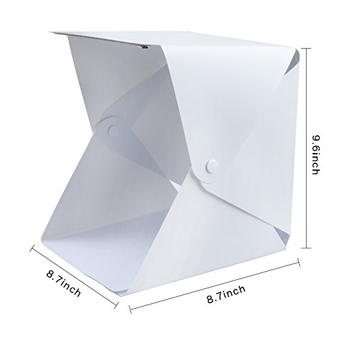 Specifications: * Power: 5V/1A * Material: White PP Film Material? * Open product size: 8.7x8.7x9.6 inches * Folding product size: 8.7x8.7x0.8 inches * Backdrops size: 18.9x8.3 inches * LED: 20pcs beads