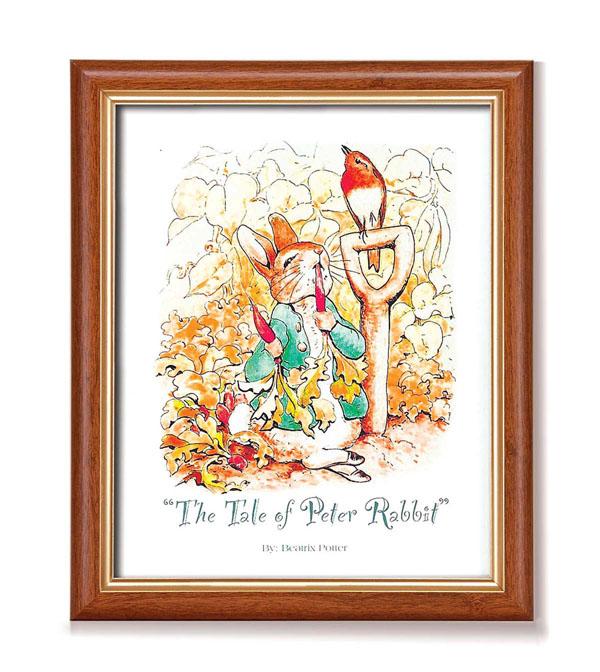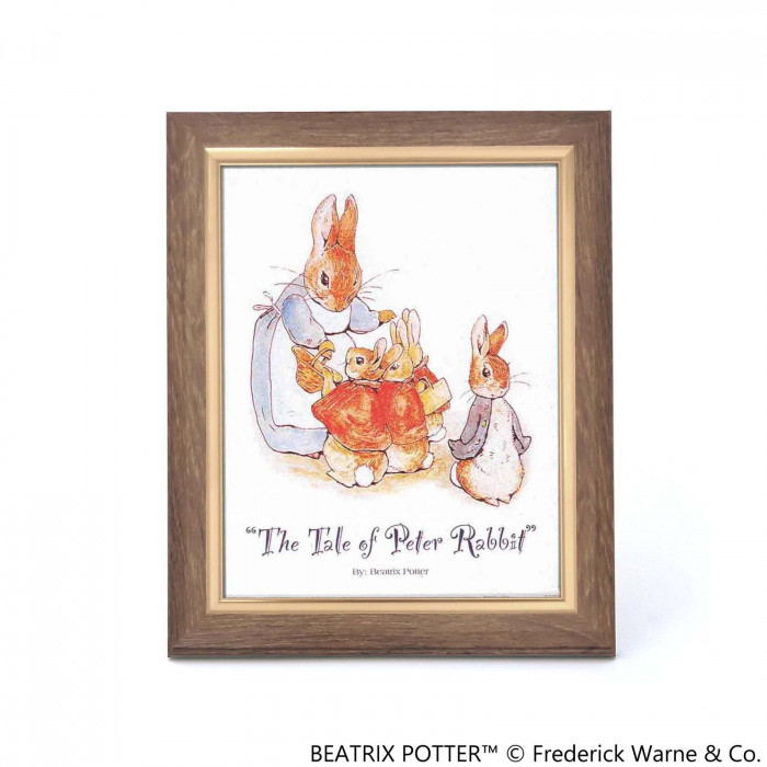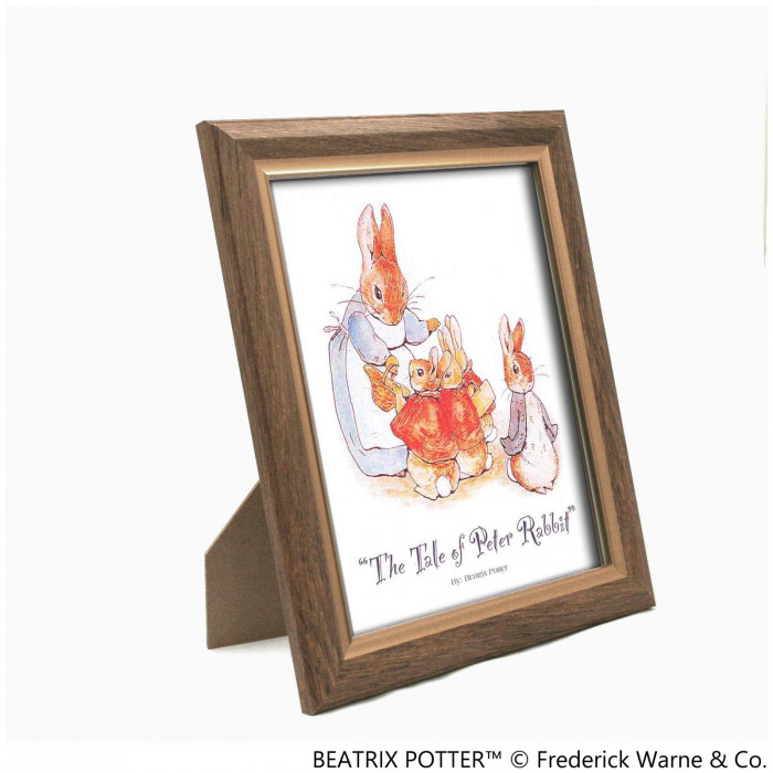 愛らしいしぐさと表情で人気のP・ラビットの絵をセットしたインチ額。落ち着いた茶色のフレームです。ラビットが可愛くお部屋を彩ります。卓上でも壁掛でも。