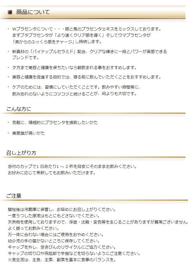Wプラセンタ(豚と馬のプラセンタエキスをミックス)で、まずブタプラセンタが「より速くクリア感を導く」そしてウマプラセンタが「奥からのふっくら感をチャージ」し持続します。新素材の「パイナップルセラミド」配合、クリアな輝きに一段とパワーが実感できるブレンドです。夕方まで美容と健康を保ちたいなら朝飲まれる事をおすすめします。美容と健康を促進する目的では、寝る前に飲んでいただくことをおすすめします。 |