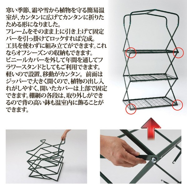 ビニールカバーを外して年間を通してフラワースタンドとしてもご利用できます。軽いので設置、移動がカンタン。 前面はジッパーで大きく開くので、植物の出し入れがしやすく、開いたカバーは上部で固定できます。棚網の各段は、取り外しができるので背の高い鉢も温室内に飾ることができます。