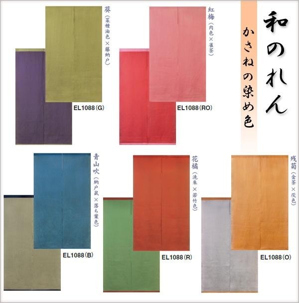 | 平安時代から伝わる色を組み合わせました。表と裏で異なった色で染め分けています。お部屋の雰囲気に合わせやすく、のれんをくぐる時やのれんが風にそよいだ時、ちらりと見える裏地の色をお楽しみ頂けます。 |