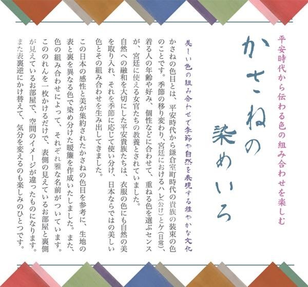 平安時代から伝わる色を組み合わせました。表と裏で異なった色で染め分けています。お部屋の雰囲気に合わせやすく、のれんをくぐる時やのれんが風にそよいだ時、ちらりと見える裏地の色をお楽しみ頂けます。 |
