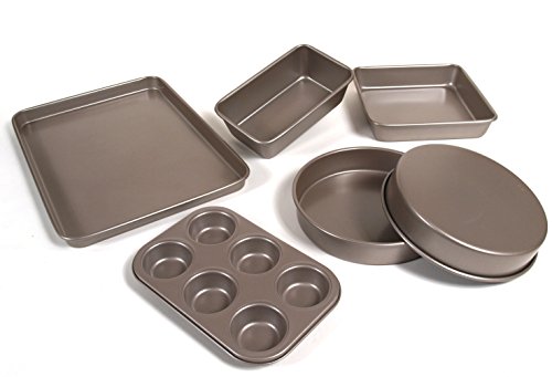 - Set includes a nine-inch loaf pan, a nine-inch square cake pan, a pair of nine-inch round cake pans, a six cup muffin pan and a seventeen-inch baking sheet