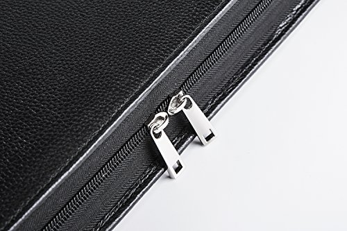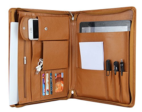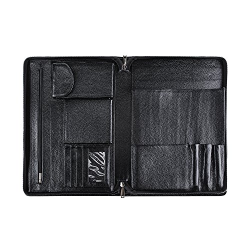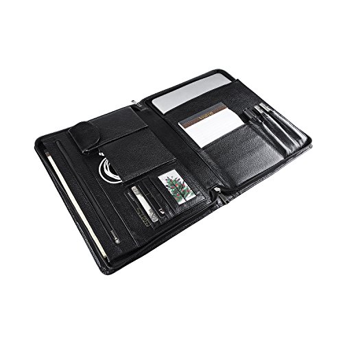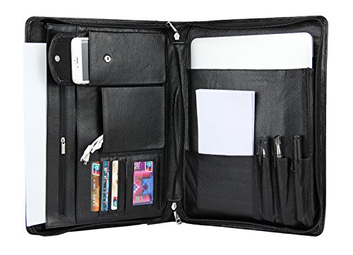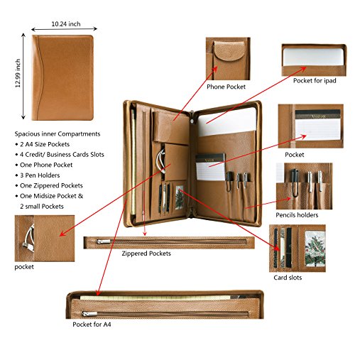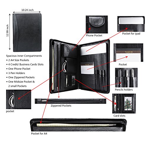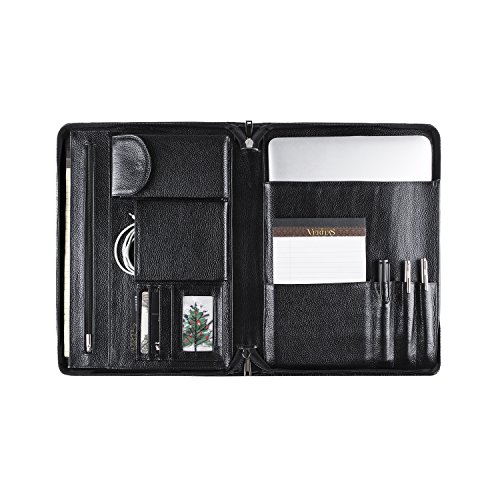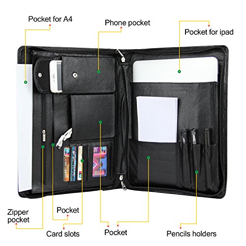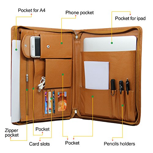 FEATURES: 1.100% genuine full-grain cow leather litchi lines -Forget all those faux leather portfolios that tear apart after a while.Enjoy supreme durability with our genuine leather portfolio now. Made from 100% authentic full-grain leather, this business organizer will satisfy all your daily needs for the many years to come! Make some heads turn around while you are holding our luxurious Padfolio! 2.Zippered closure for great safety and ultimate organization- We have the perfect solution for you since our professional organizer is equipped with a zipper. It will make carrying the portfolio a secure and safe process as the zippered closure will keep your notes and personal items protected! 3.Two compartments and numerous slots and holders for your convenience-Keep all your essentials organized and handy wherever you go with this business portfolio.It features 2 compartments. the right one is the writing pad holder,a small pocket for notebook and 3 pencil holders;the left one has 5 pockets,a zippered pocket to stow every important thing you need,a mobile phone bag,two open pockets(including 1 big pocket for 11-13inch Mac book Air or A4 paper and so on,1 small pocket for database). 4.Perfect for business executives, this luxury padfolio can be really helpful during travel, presentations and meetings. Even if you are just starting out on your career, carry it along for interviews and discussions. 5.Perfect Suitble-The padfolio organizer fits for most of models of device,MacBook Air11-13inch/MacBook Pro13inch/Microsoft Surface Book 13.5inch/iPad Pro 12.9 inch/Microsoft Surface Pro 3,4. 0