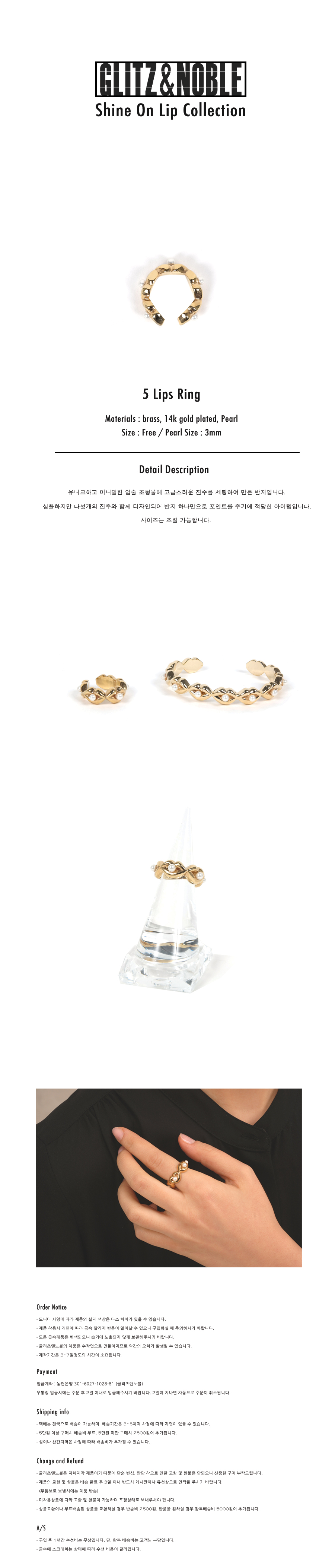 | SHINE ON LIP COLLECTION: SHINE ON LIP 컬렉션에서는 입술이 주는 시각적인 요소와 감정적인 요소에 영감을 받아 다양한 디자인의 주얼리를 연출했습니다. 입술에서 보여지는 감정, 입술의 라인, 입술의 부드러움과 강렬함이 교차되는 느낌, 입술이 만들어내는 형태들에서 다양한 영감을 받았으며, 입술은 하나의 오브제로 착용자에게 다양한 감성을 느낄 수 있도록 디자인 했습니다. PRODUCT DETAIL: 유니크하고 미니멀한 입술 조형물에 고급스러운 진주를 세팅하여 만든 반지입니다. 심플하지만 다섯개의 진주와 함께 디자인되어, 반지 하나만으로 포인트주기에 적당한 제품입니다. 소재는 황동 + 16k 골드도금으로 제작되었고, 사이즈는 프리입니다. (사이즈 조절 가능) 글리츠 앤 노블은 모든제품을 직접 제작함으로써, 주문이 들어온 후에 제작하게됩니다. 주문하고 제품을 받을 수 있는 기간은 2일 ~ 5일 소요될 수 있습니다. |