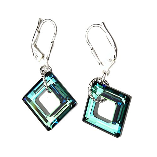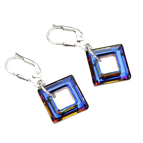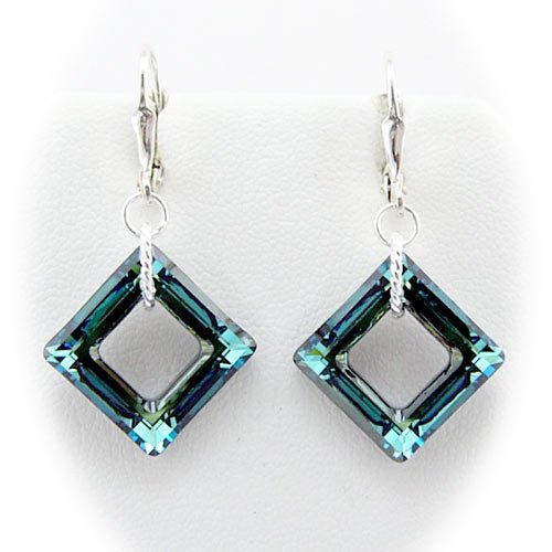 Beautiful 14mm (0.55 inch each side of square) bermuda blue crystal square hangs from sterling rings to form a beautiful pair of earrings. Crystals hang from solid 925 sterling silver leverback earrings, approx 7/8 inches high x 3/4 inches wide from base of earwire. Made with Swarovski Crystals. The solid sterling silver bail is stamped 925 and ITALY so you know that they are of the top quality. Gift box included, color or style may vary.Feature