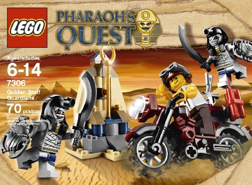 LEGO Pharaoh's Quest Golden Staff Guardians Mac McLoud is after the Pharaoh's golden staff in the temple. Guarded by two scary mummies, McLoud will need to fight them to retrieve the treasure. LEGO Pharaoh's Quest Golden Staff Guardians comes with mini figures of Mac McLoud and 2 mummies. The easy to build temple comes complete with a secret compartment to house the golden staff. Riding his motorbike and armed with a stick of dynamite, McLoud will have to fight the mummies to get the golden staff. Why You'll Love It: Fans of Egyptian adventures will love the chance to be a part of the action. Age: 6 to 14 years Features Mac McLoud and mummy mini figures Blocks to build a temple Motorbike Golden staffFeature
