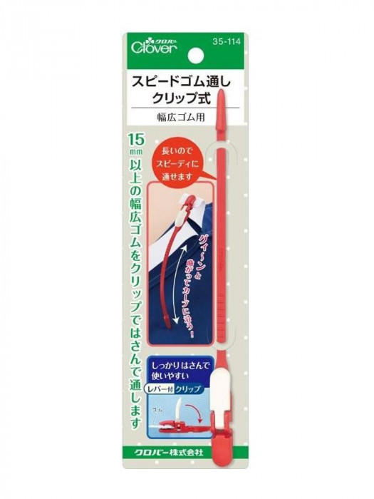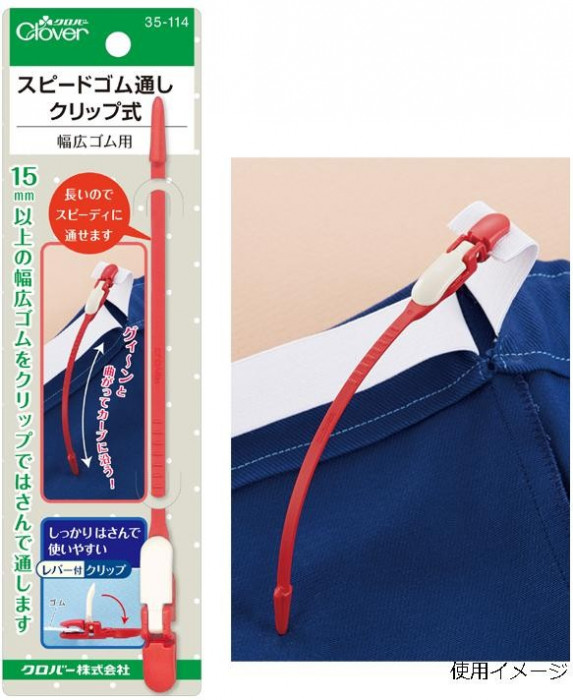 ウエストゴムのソーイング・補修に。15mm以上の幅広ゴムを、クリップでしっかりはさんですばやく通せるゴム通しです。強力クリップではさむので、通す途中でゴムが落ちず、ゴムを折らずにそのまま通せます。先端が長く柔軟な樹脂製なので、ウエストなどのカーブに自然に沿って通せます。 |