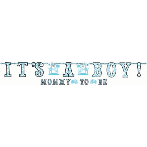 -. Feature : Contains 1 Large 8 2/5' x 10" Letter Banner featuring the message "It's a Boy!" with each letter P.R.Inted with blue zebra stripes. / Contains 1 Small 6' x 4" Banner, featuring the phrase "Mom To Be" with leopard P.R.Inted blue background. / Large banner includes 2 blue Mom and Baby Giraffe cutouts used to separate the words. / Small banner includes 2 blue Mom and Baby Elephant cutouts used to separate the words.