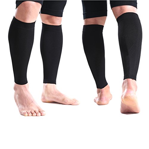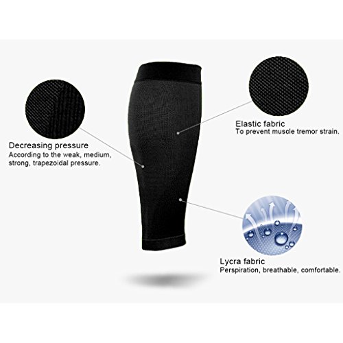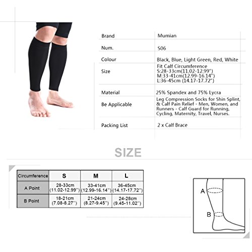 Features: 1. Made of durable, high quality materials and painstakingly measured to ensure an exact fit, we make absolutely sure you get what you paid for! They're so comfortable, you'll forget you have them on! 2. It's known that a warm muscle is less likely to be injured, and performs better overall. Though breathable, our compression sleeve is sturdy enough to help increase blood flow throughout your leg muscles, and offers enough resistance to give your legs extra support, while enhancing your athletic activities. 3. If you've ever dealt with Shin Splints, you know the discomfort and outright pain they can bring. Feel more confident to stay on your feet and avoid that unwanted pain as well as muscle cramps while you travel, work, or play! No matter if you're a runner, nurse, are pregnant, or just experience occasional leg pain, our sleeve is just what you need! 4. When it comes to compression gear, not all are created equal. Some don't fit right, and some don't work right, but with Run Forever Sports, you'll be sure to get a quality fit with a true graduated compression strength of 20-25mmHg, which will help improve performance while alleviating leg pain and swelling. Application: protect the calf muscles, reduce muscle vibration damage, Lycra fabric, breathable perspiration, has a good quick-drying and antibacterial. Specification: Brand: Mumian Model: S06 Colour: Black Material: Lycra, nylon, polyamide Size: S: 11" M: 12.99-16.14" L: 14.17-17.7" Quantity: 1 Pair 0