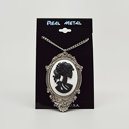 -. Binding : Jewelry -. Brand : Real Metal -. Department : womens -. EAN : 0803853004337 -. Feature : Cast in high grade pewter with an anti-tarnish finish / Two color resin cameo in a silver oxide antique finish frame / 2 1/2 inches high x 1 1/2 inches wide on 20 inch neckchain / Hand crafted and MADE IN USA -. Label : Real Metal Jewelry JPI Inc. -. Manufacturer : Real Metal Jewelry JPI Inc. -. Model : NK-624 -. MPN : NK-624 -. PartNumber : NK-624 -. ProductGroup : Jewelry -. ProductTypeName : FASHIONNECKLACEBRACELETANKLET -. Publisher : Real Metal Jewelry JPI Inc. -. Studio : Real Metal Jewelry JPI Inc. -. Title : Gothic Lolita Skull Cameo Black on White Pendant Necklace -. UPC : 803853004337